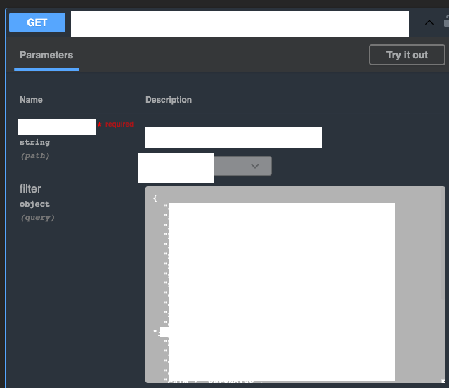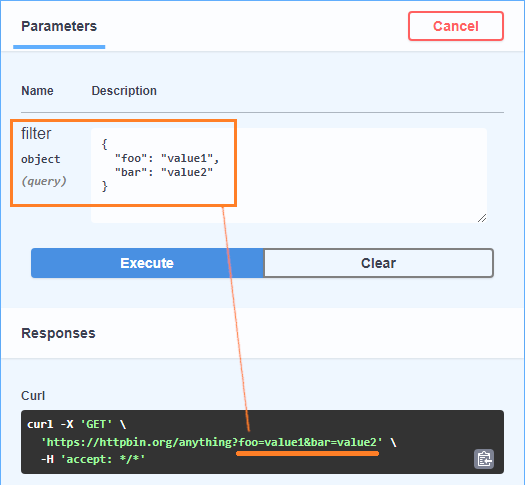 ...?foo=value1&bar=value2尽管Swagger中的“参数”部分将其显示为单个对象类型的参数,但实际的使用单独的key=value参数。