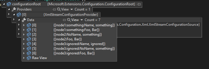 var node3 = configurationRoot.GetSection("node3:ignored").Get<Node2>();VisualStudioforconfigurationRoot中的调试可视化程序显示了这些键。