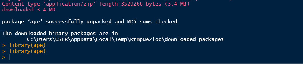我也尝试使用终端下载,但这也失败了。我已经检查了R版本,APE与Rv3.6兼容。你知道为什么这个包不能下载吗?