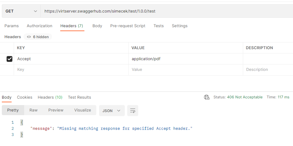 SwaggerHub模拟服务器只支持JSON、XML和YAML响应。如果请求任何其他媒体类型(例如Accept: application/pdf或Accept: image/png),则返回406个响应。