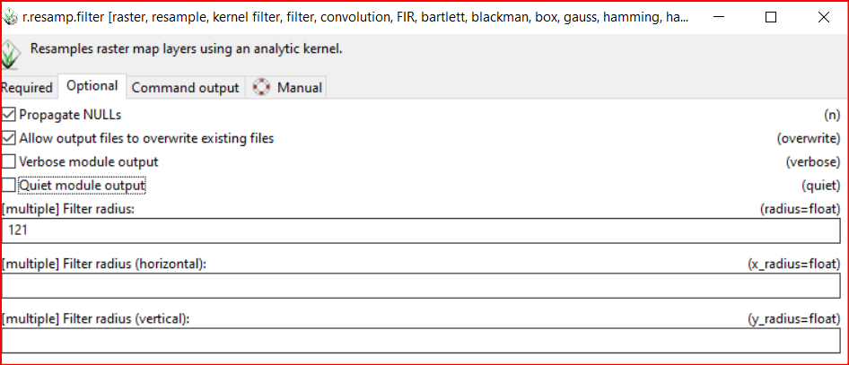 为了使用光栅数据执行GWR,这些数据需要具有相同的像素大小。这意味着,我的精细分辨率图像需要放大,以匹配粗波段的空间分辨率。这种精细波段的提升需要使用高斯核(即PSF)。我发现GRASS GIS有一个叫做r.resamp.filter的工具。我正在尝试运行这个函数,但是我得到了以下错误: