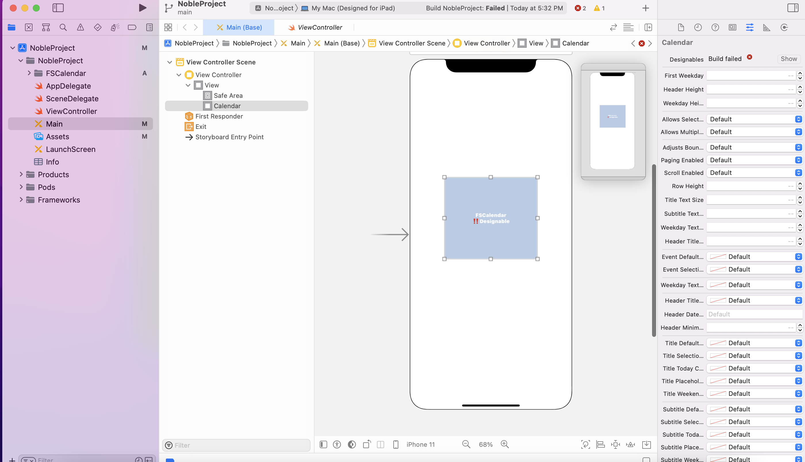 其次,我将FSCalendar拖放到项目中,如下图所示,并在主视图下创建了一个定义自定义类' FSCalendar‘的视图,它只显示了FSCalendar designable,