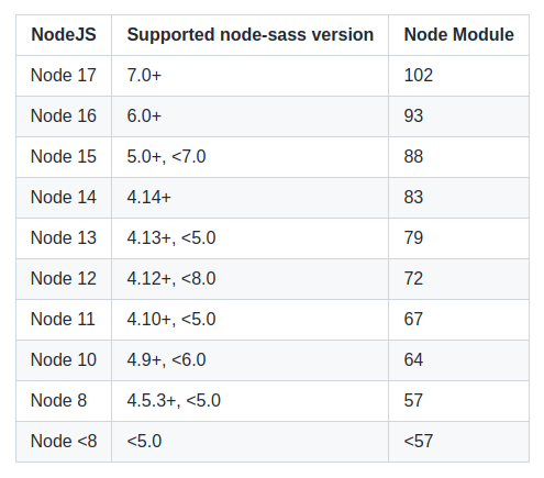 根据节点-sass github页面,支持的node.js版本因版本不同而有所不同。