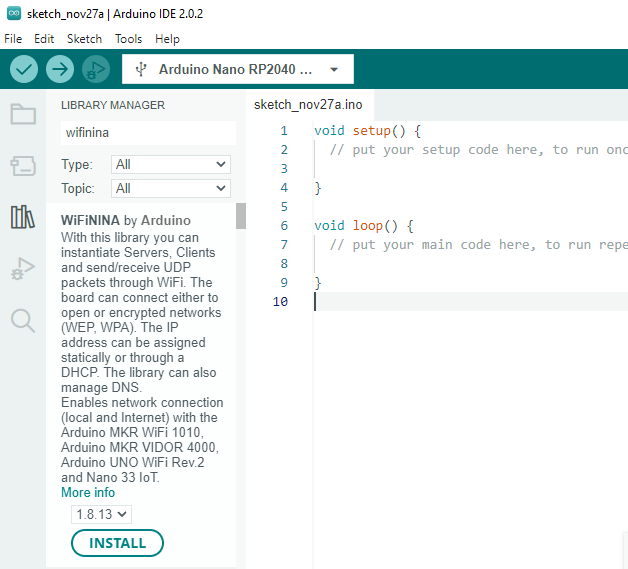 更新到Arduio的最新版本(目前为2.0.2),并安装WiFiNINA库。
