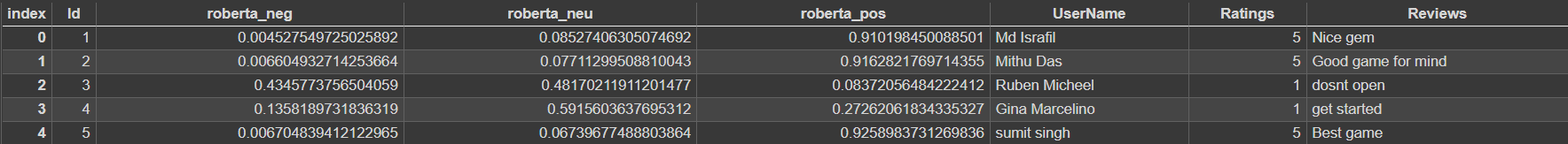 None of [Index(['roberta_neg', 'roberta_neu', 'roberta_pos'], dtype='object')] are in the [columns]. 我使用的代码是: