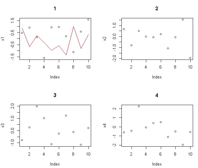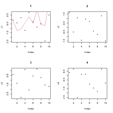plot(x1,t="p",main = "1") ; lines(rnorm(10),col=2)