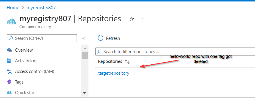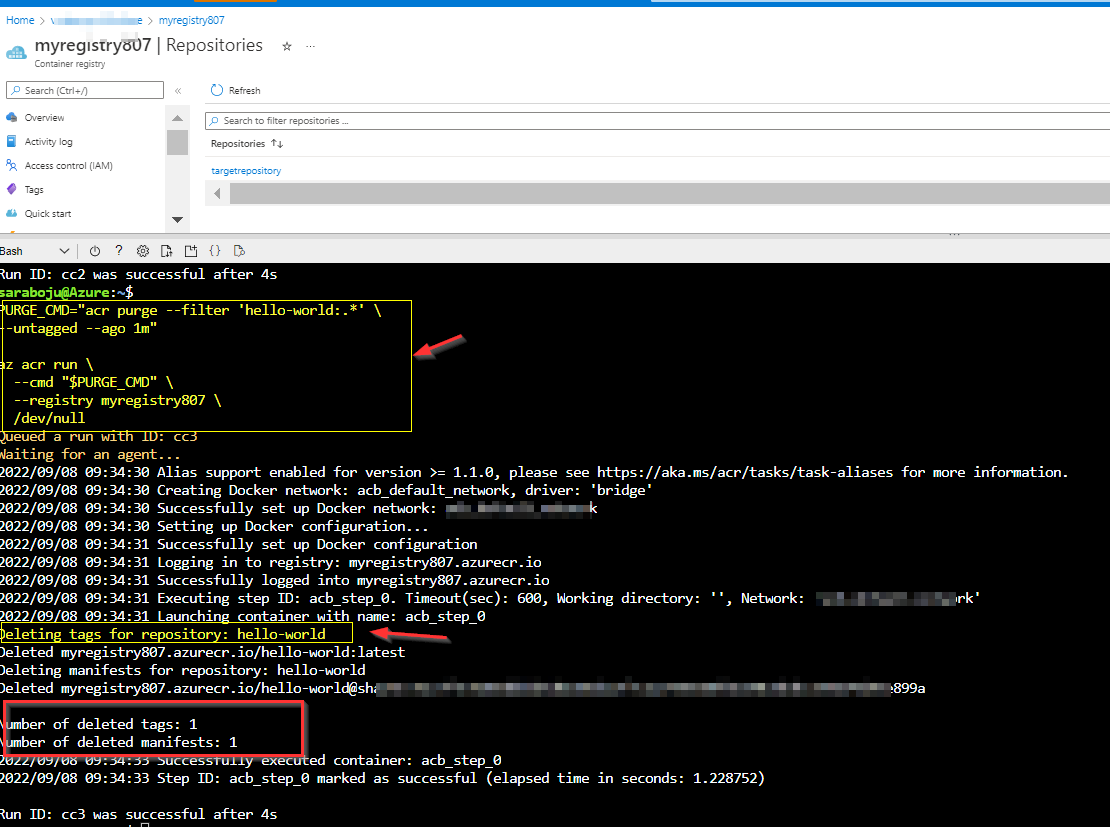 az acr run --cmd "acr purge --filter 'hello-world:.*' --untagged --ago 1d" --registry myregistry807 /dev/null它首先删除标记,然后删除未标记的清单,然后删除注册表。