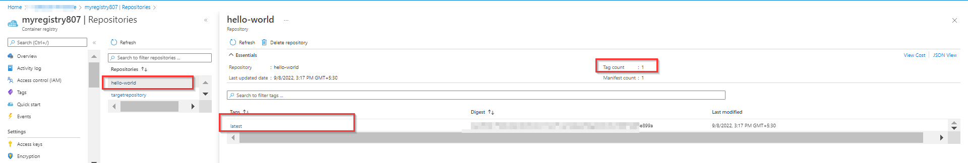 我尝试在我的环境中复制相同的内容--我有两个存储库,hello-world with 1 tag: latest