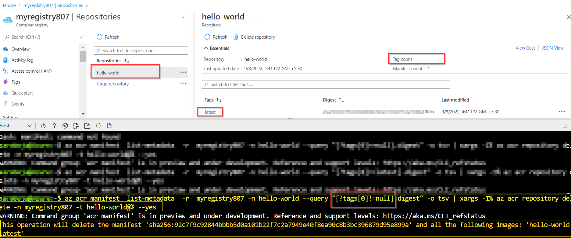 az acr manifest list-metadata -r myregistry807 -n hello-world --query "[?tags[0]==null].digest" -o tsv | xargs -I% az acr repository delete -n myregistry807 -t hello-world@% --yes