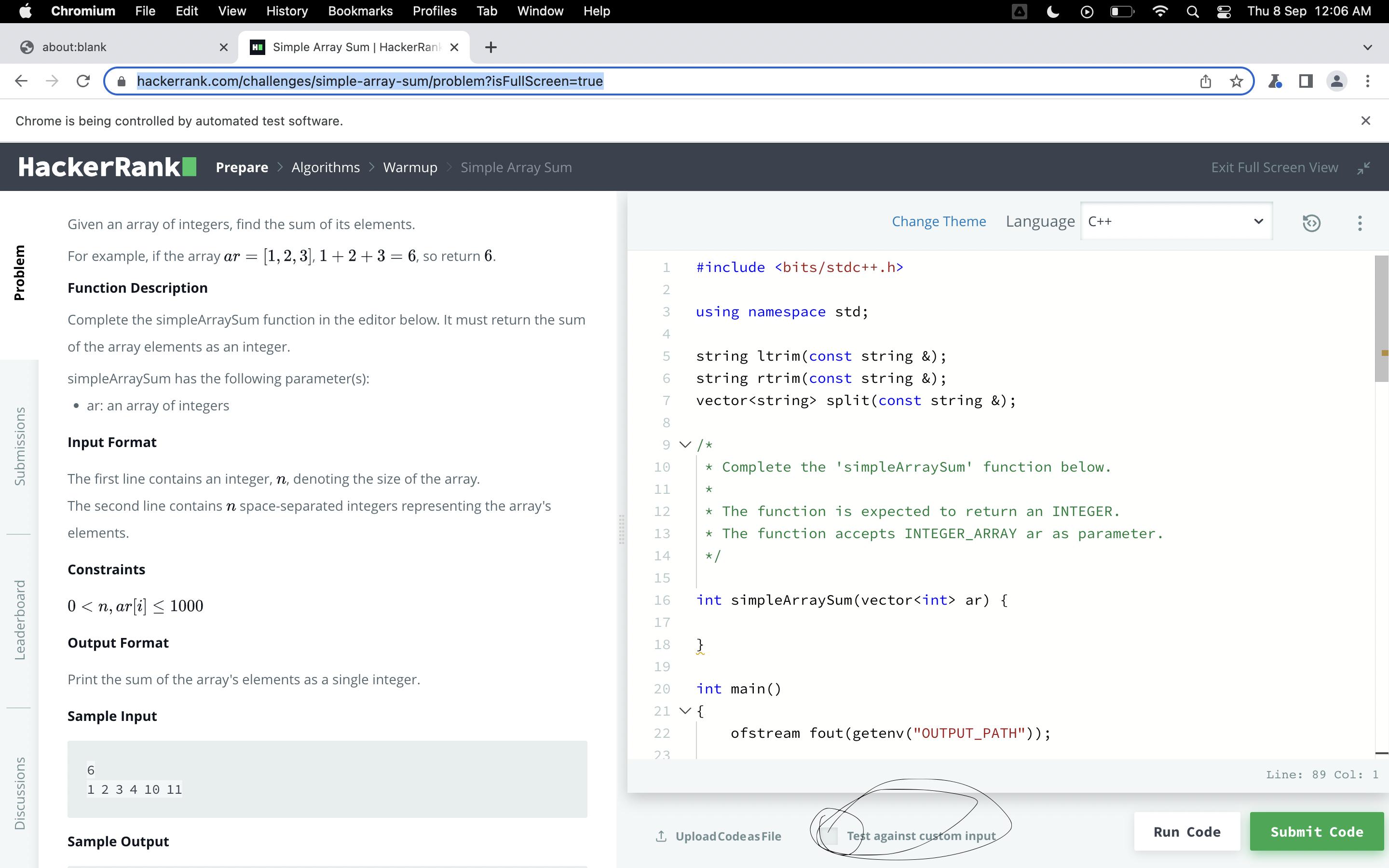 我试图提交hackerRank网站的挑战,通过自动化使用傀儡。单击“解决挑战”按钮后,代码将出现在下一页,但不会选择复选框元素,即“文本与自定义输入”