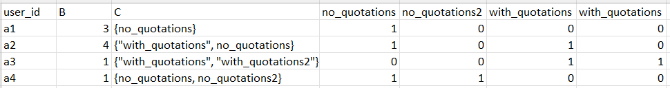 user_id B value no_quotations no_quotations2 with_quotations with_quotations2