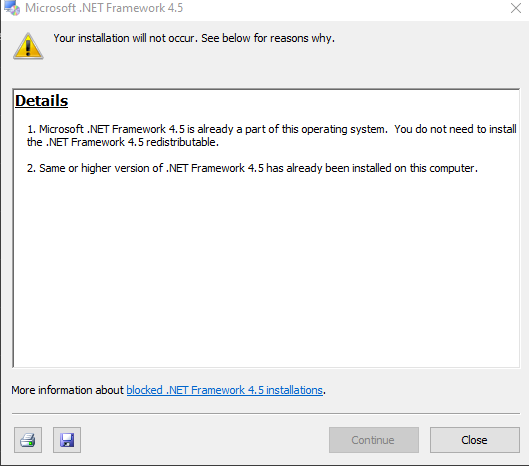 我尝试过安装.net Framework4.5运行时,但是我得到了以下错误。