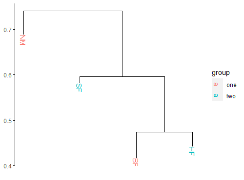 ggplot(as.dendrogram(zz))输出(同样,与上面的分析不同,但您可以使用自己的代码来修复它)