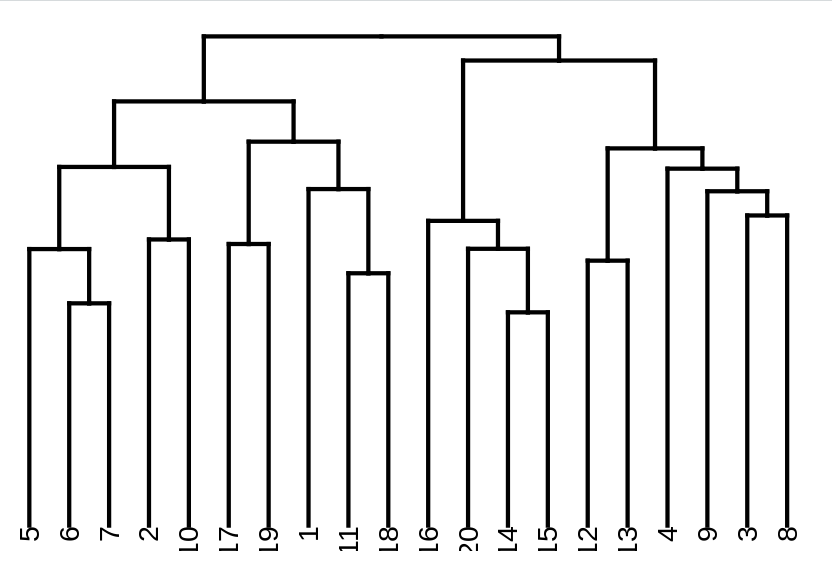 zz <- hclust(as.dist(dissim), method = "average") #use desired method, "average" is the default in vegan:::plot.meandist获取树状图的代码: