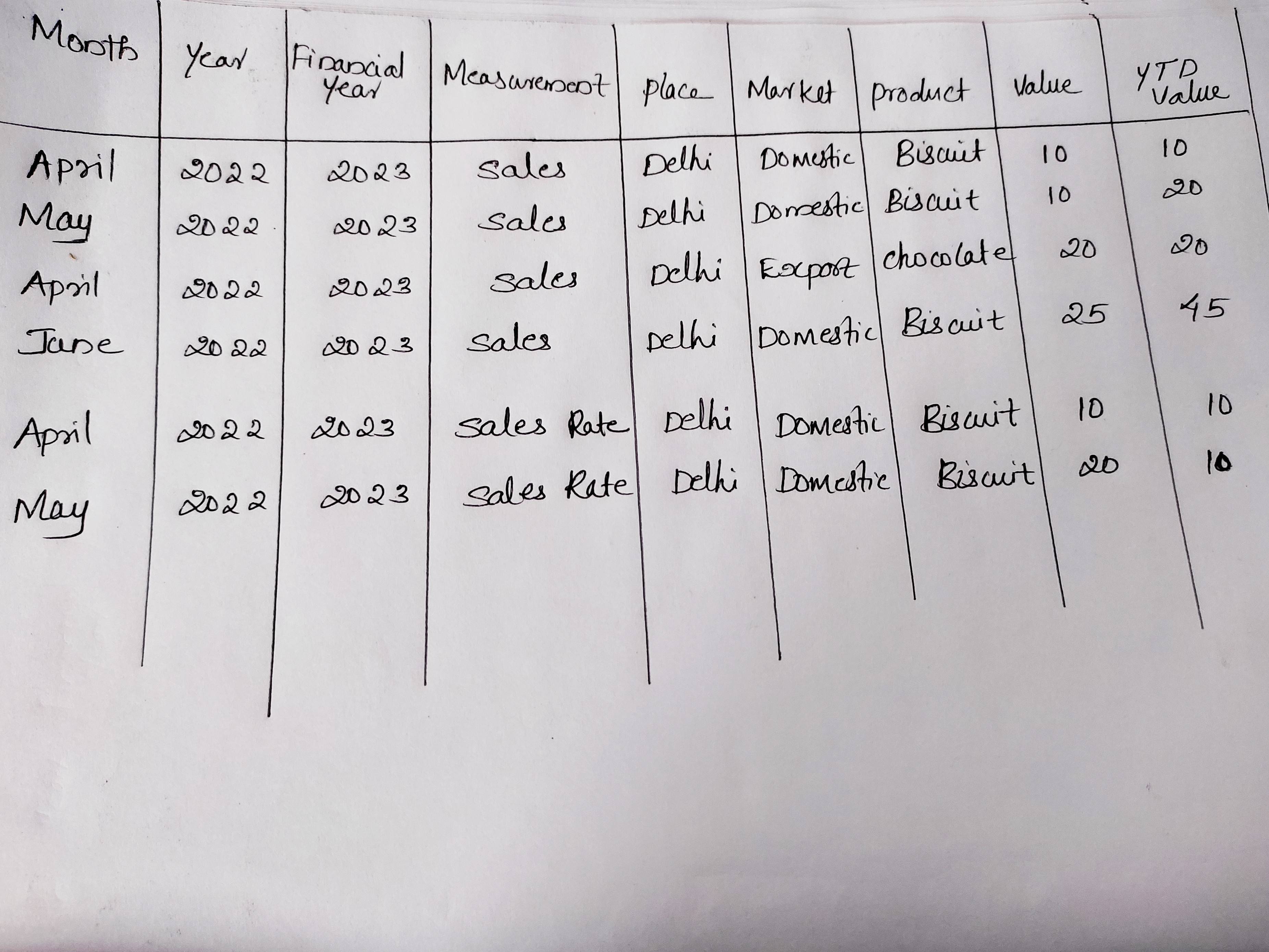 2 June 2022 2023 Delhi Domestic Biscuit 25.0 0.0您可以通过每个月的销售值进行汇总,但关键是每个月的销售值和销售比率值都是单一的。