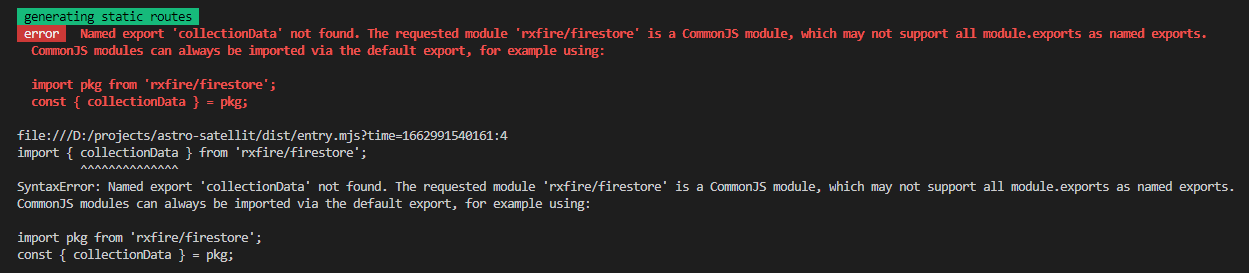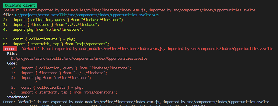 我试着构建我的天文应用程序。我有一个使用svelte和rxFire的组件,但是当我试图构建id时,我会收到这个错误。尝试该建议,将我带到另一个错误,如“默认成员未导出”。它可以是来自firebase v9的bug,也可以是Vite的编译,但是如何修复它呢?