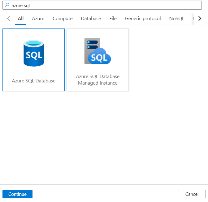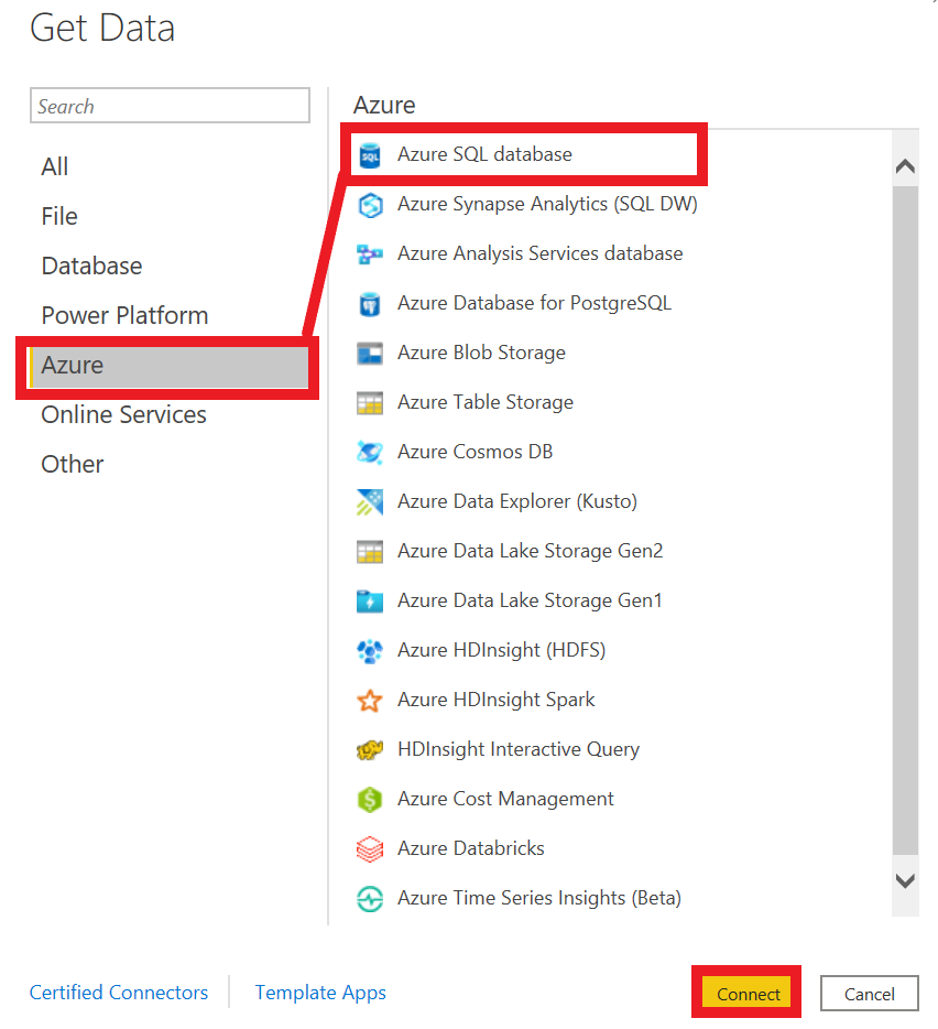 在Power桌面中,转到获取数据,单击Azure并选择Azure SQL数据库。单击“连接”。