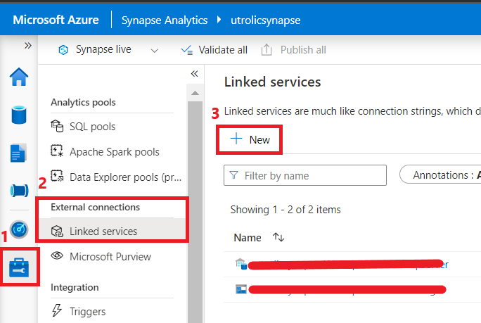 Manage符号。单击它,然后单击Linked Services。要创建新的链接服务,请单击+ New.