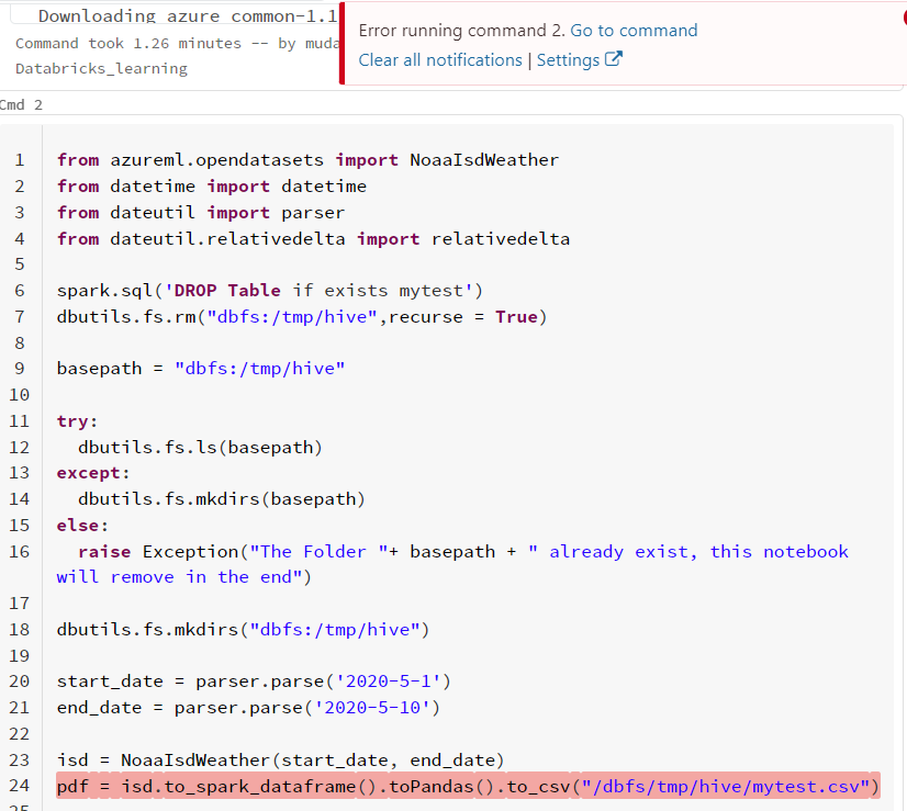 我已经采取了蔚蓝的数据集,可供实践。我从那个数据集中得到了10天的数据,现在我想以csv格式将这些数据保存到DBFS中。我面临一个错误: