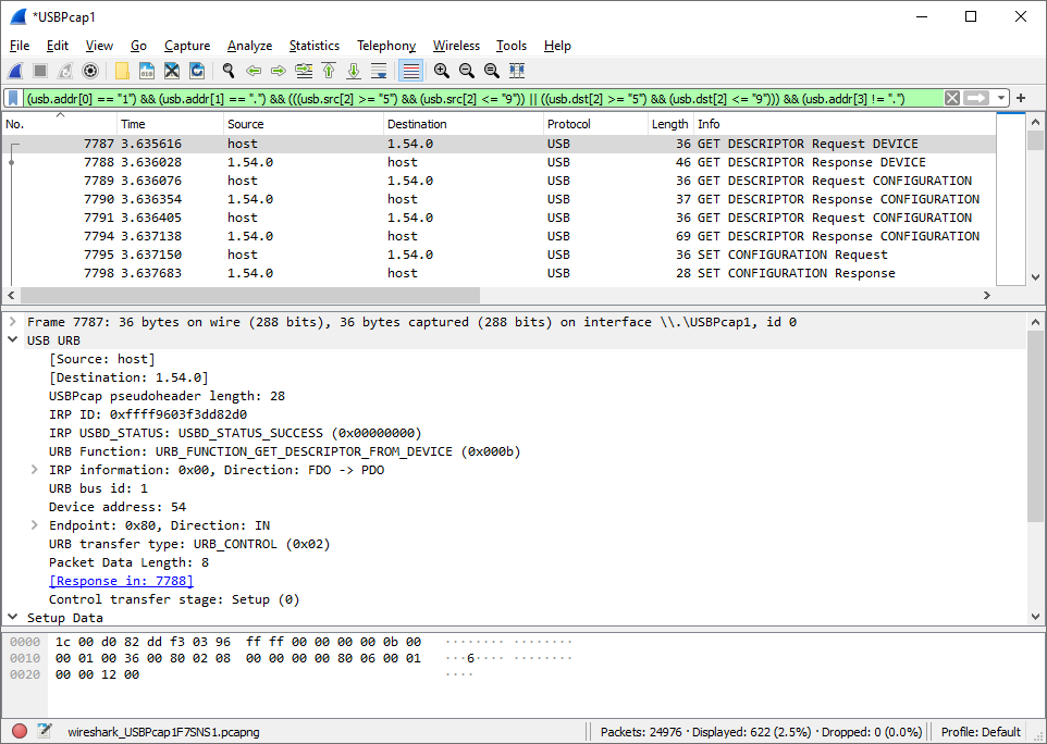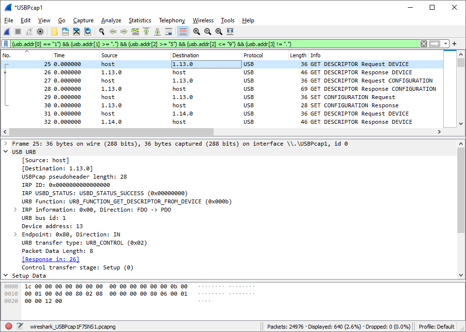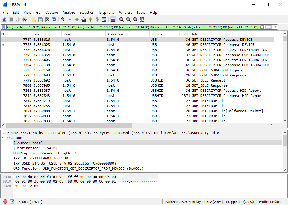 我使用Wireshark捕获USB流量,以便分析HID设备的描述符。
