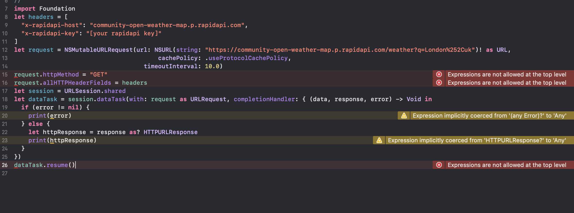 let request = NSMutableURLRequest(url: NSURL(string: "https://community-open-weather-map.p.rapidapi.com/weather?q=London%252Cuk")! as URL,
