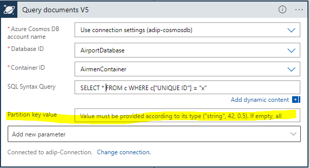 当分区键值字段为空时,来自逻辑应用程序的查询并不是在CosmosDB中的所有分区中搜索。当从数据资源管理器运行完全相同的查询时,将查询所有分区,并返回所有预期数据。当使用日志分析从逻辑应用程序运行查询时,我可以看到,一个查询只在一个分区范围内运行,而不是返回所有预期的结果。(其中一些来自被击中的分区)
