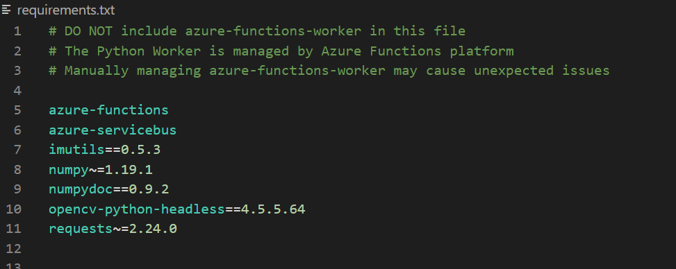 This error occurs when a function is executed. The function app was deployed using the CiCd pipeline and all dependencies are include in requirements.txt as shown below.