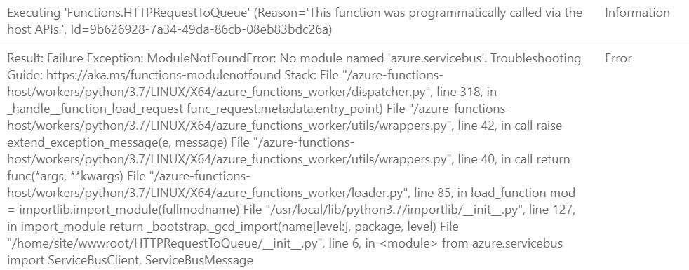 在使用cicd管道部署azure函数时,我得到了一个错误。错误是ModuleNotFoundError: No module named 'azure.servicebus'.,但实际情况是,在cicd管道上构建包时已经安装了服务总线模块。