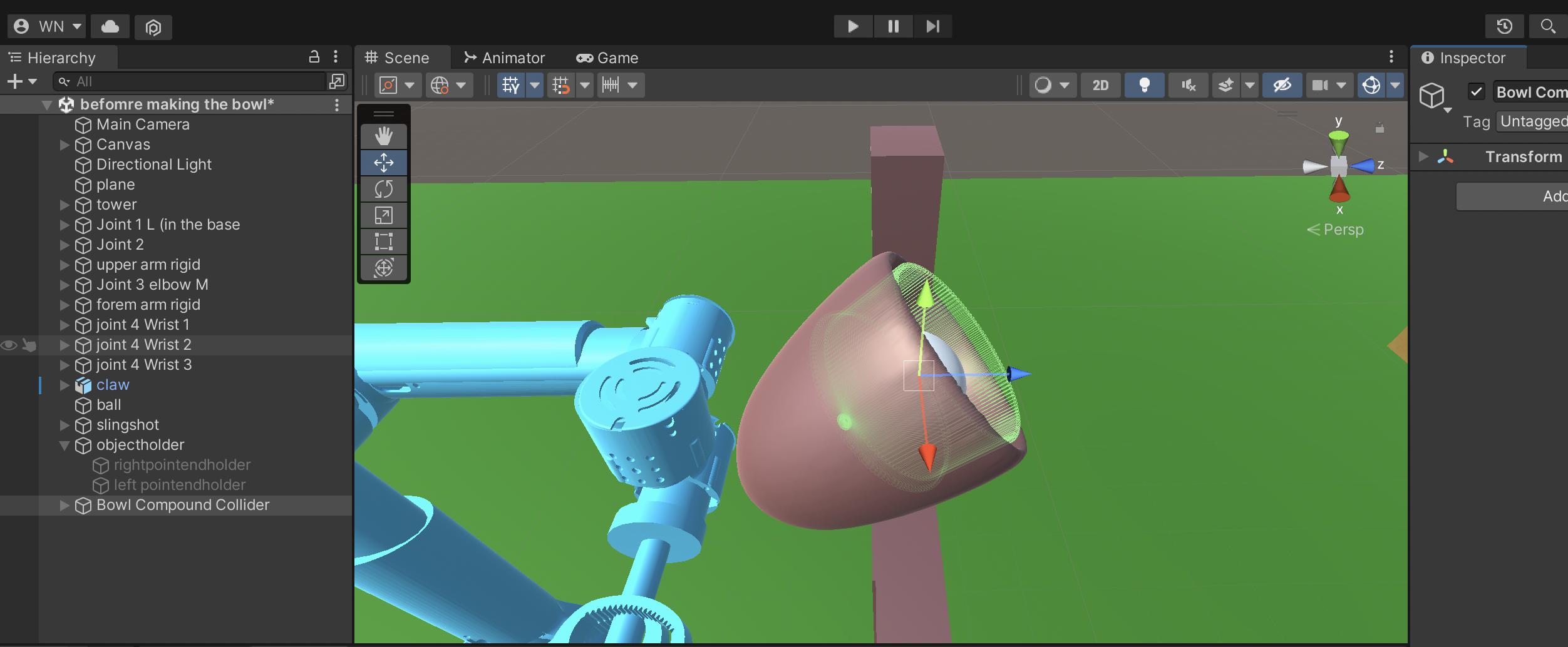 最好不要在爪子上安装对撞机。这是因为你把刚体和动画混为一谈,这会变得很混乱。我会记起所有的东西,特别是爪上的箱子对撞机。将其设置为触发器。您可以将布尔值放入if语句以打开和关闭爪。这样,您可以将对象的位置设置为在爪处(如果他们正在触摸)。