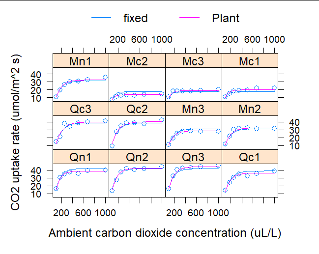 fm4CO2.nlme <- nlme(uptake ~ SSasympOff(conc, Asym, lrc, c0), data=CO2,