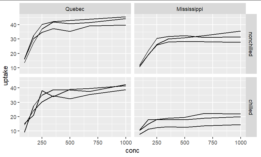 ggplot(CO2, aes(x=conc, y=uptake, group=Plant))+