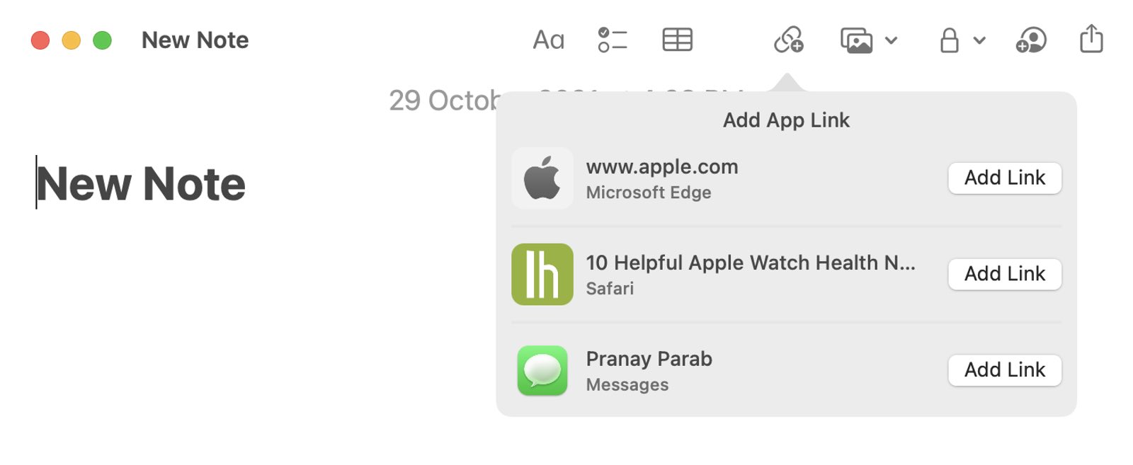 从macOS 13 Ventura开始,苹果在Notes工具栏上添加了一个按钮,允许您快速将链接和通用链接插入到其他应用程序(如Safari或Message)中的便笺中。