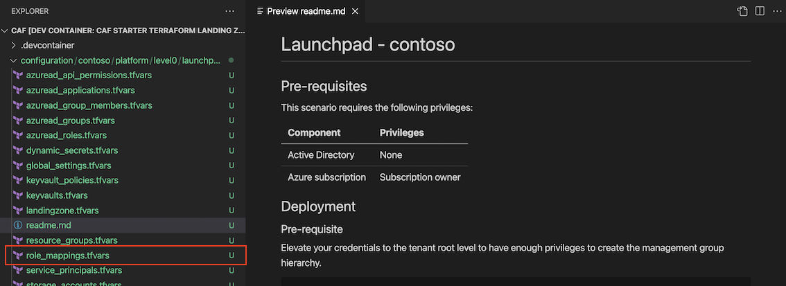 云采用框架并不是要在一些任意的资源上放置一些角色。您必须从层次层次的角度来看待这个框架。每个层次结构都有自己的目的,因此使用自己的一组权限来部署该特定步骤所需的资源。我引用了aztfmod (Terraform + CAF)中的一些角色映射模板,以便您了解角色/权限结构。