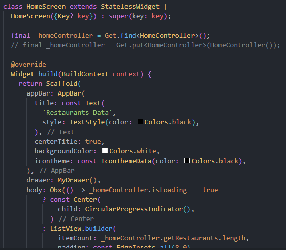 我是GetX颤振状态管理的新手。我使用两个控制器,一个用于登录,另一个用于家庭数据(通过API调用获取一些餐馆数据)。我在装订上遇到麻烦了。我在我的应用程序中使用绑定来跟踪GetX文档。但是我不能正确地使用它,也不能得到错误。以下是代码-: