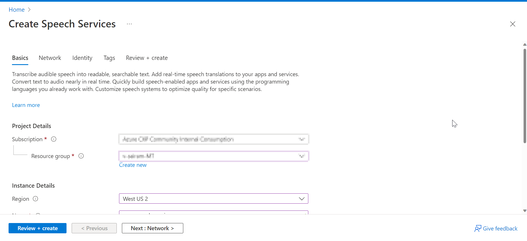 speech_config = speechsdk.SpeechConfig(subscription="", region="westus2")
