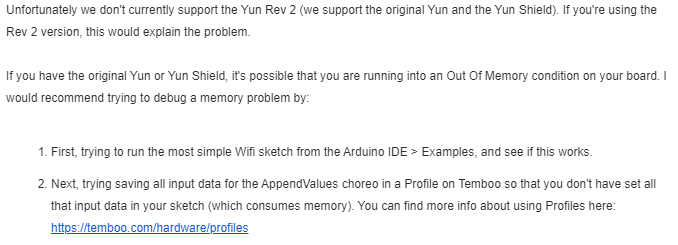 所以我正试图通过to和Arduino Yun来更新一张gooogle表。我可以在AppendValues站点上运行AppendRow choreo和AppendRow choreo,所有内容都会更新,但是通过arduino .ino运行这些舞蹈不会在google上显示任何更新。不过,我在运行舞蹈时得到了0的返回代码。所以我知道Oauth在工作,google和temboo在说话,所以我的代码一定有问题吗?