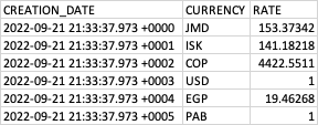 CREATION_DATE::TIMESTAMP_NTZ, JMD::NUMBER(19,6) AS JMD, ISK::NUMBER(19,6) AS ISK, COP::NUMBER(19,6) AS COP