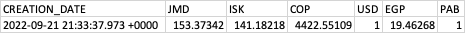 SELECT CREATION_DATE, JMD, ISK, COP, USD, EGP, PAB