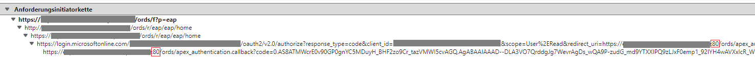 它在某种程度上起了作用,但先端提供的重定向url似乎会导致用户被重定向到https://our-domain/:80/ords/apex_authentication.callback?..。然后浏览器显示一条错误消息。如果用户从url中删除":80“,并且不更改任何其他内容,他将被重定向到APEX应用程序,一切都正常。
