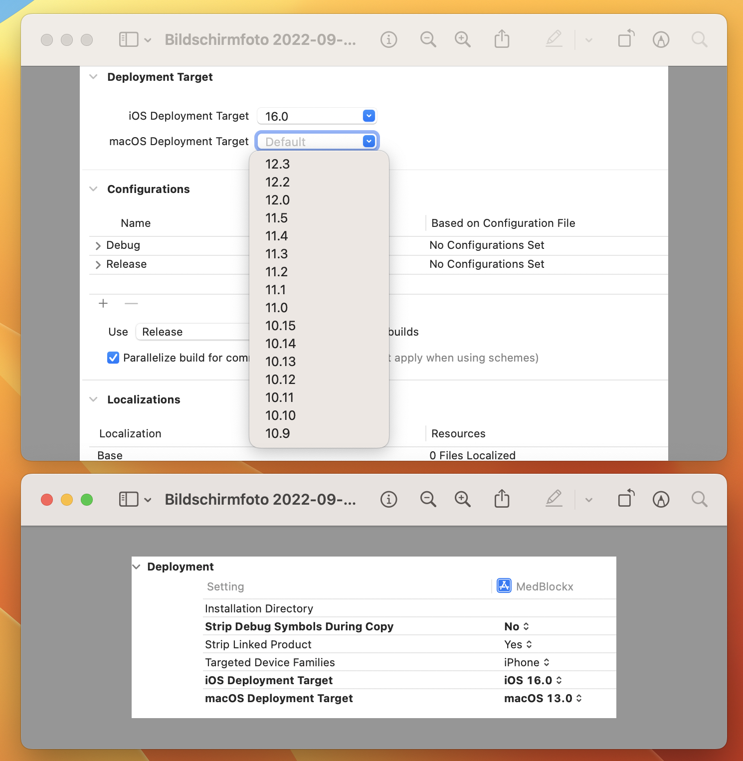 我检查了Deployment Target在Project > Info和Project > Build Settings中,在后者中,Deployment Target被设置为macOS 13,但是在前者中,不可能从下拉菜单中选择macOS 13。
