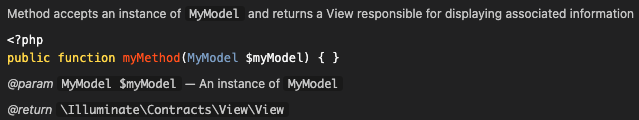 基本上,这是一种总结方法/函数所做的、希望作为它的参数(如果有的话)以及它返回的内容的方法。IDE/代码编辑器(如VSCode、崇高文本、PHPStorm等)实际上可以阅读这些注释,并在使用它们时帮助您提供提示、自动完成等。
