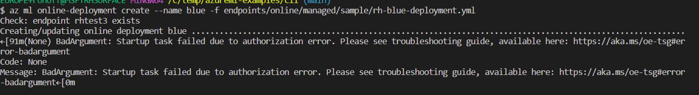 az ml online-deployment create --name blue -f endpoints/online/managed/sample/blue-deployment.yml错误消息中的“故障排除”指南引用了存储帐户(和)可访问性的重要性,但不考虑usecase,其中AML位于私有VNET:https://learn.microsoft.com/en-us/azure/machine-learning/how-to-troubleshoot-online-endpoints?tabs=cli#authorization-error中。