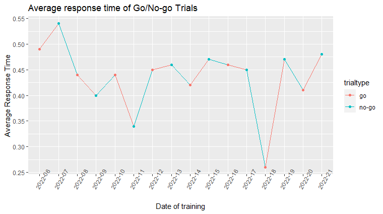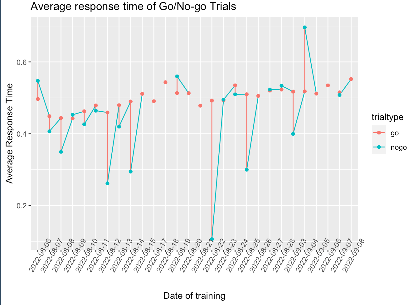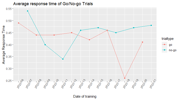 我正在尝试创建一个线条图来显示一个Go/No-go任务的响应时间。我对这些线有困难,因为它们没有连接到预期的值。我只想让“去”变成一行,而“不去”则是一行。有人知道怎么纠正这个问题吗?我已经包括了线条图当前的外观和数据集的一个例子。谢谢!
