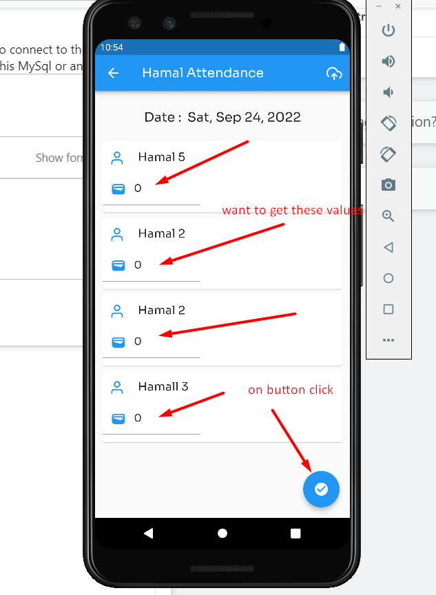 我正在做一份考勤申请,在那里我给工人分配工资。我想把给工人的所有工资都存入数据库。但问题是,我想访问所有给定的值,在按钮点击。我不知道如何在颤栗中做到这一点。我是个初学者。