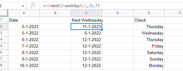 我正在寻找一个谷歌表格公式,以找到第一个星期三之间的两个日期。日期是05-01-2023和11-01-2023,第一个星期三是第11.例05-01-2022和11-01-2022,第一个星期三是第5.
