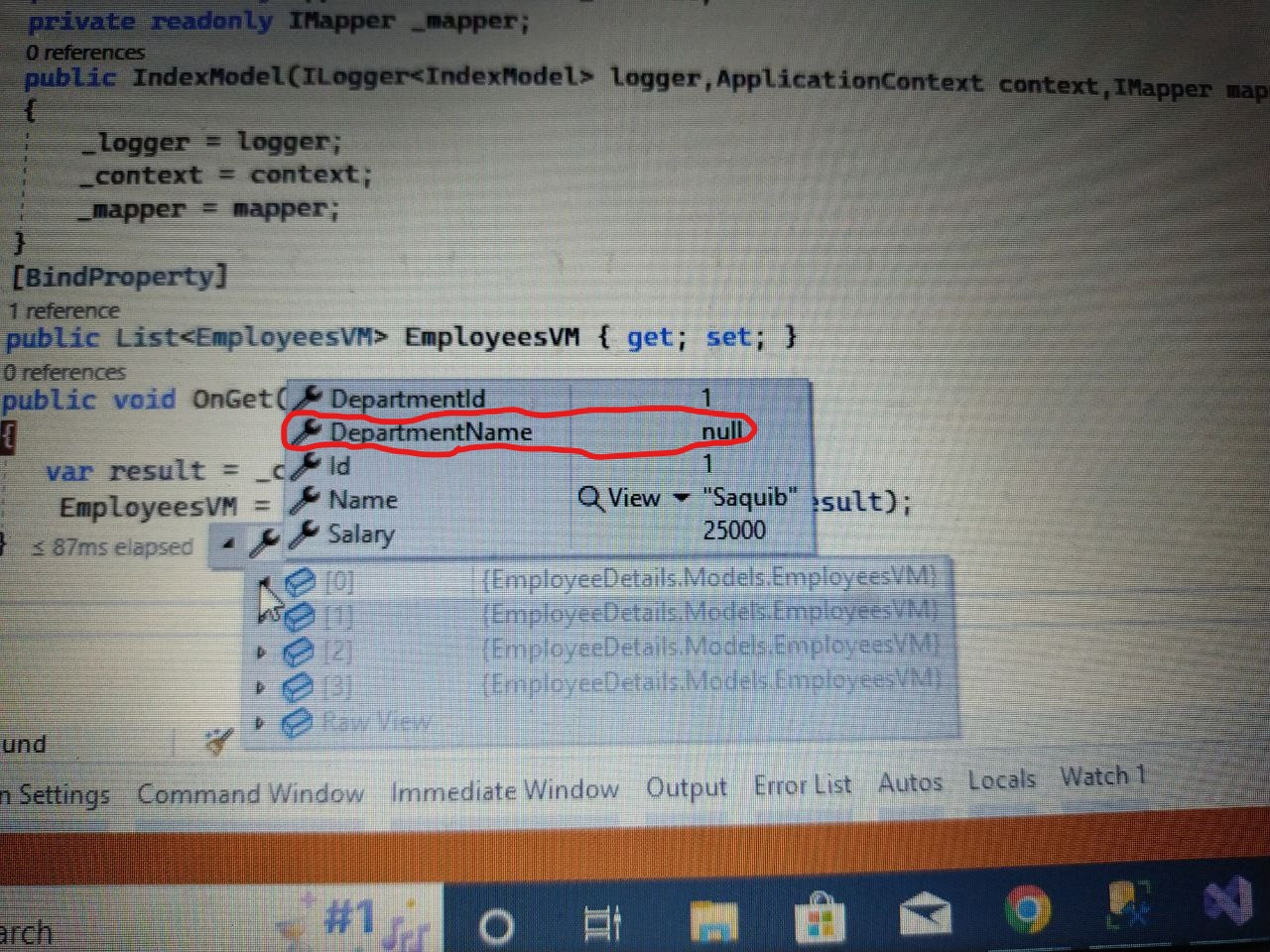 这是显示员工和部门数据的视图模型。在这里,我还想向DepartmentName展示