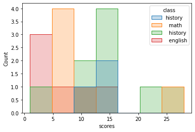 8 Fred english [ 4, 1, 2]我想用x轴表示scores,y轴表示scores的计数,标签(或色调)由class决定。最终,它看起来类似于这个情节(来自https://seaborn.pydata.org/generated/seaborn.histplot.html的代码)