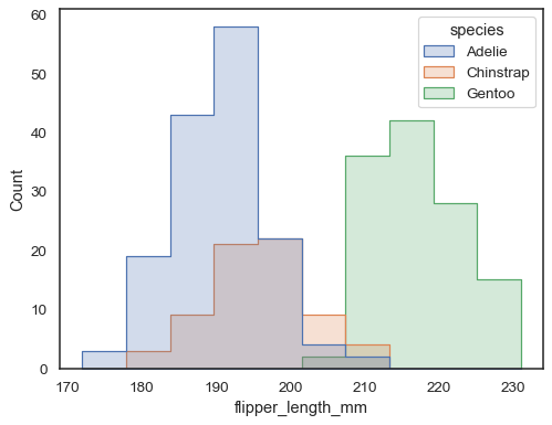 sns.histplot(penguins, x="flipper_length_mm", hue="species", element="step")