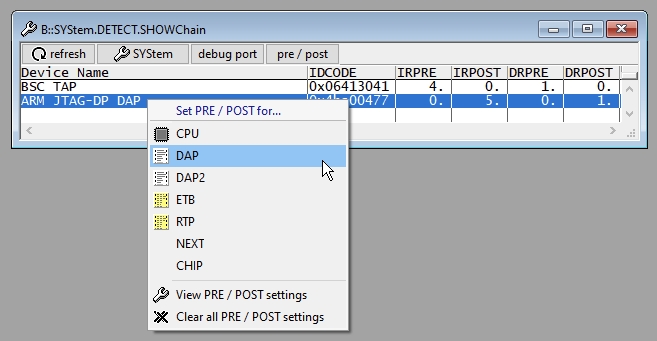 要为预位和后置位找到正确的值,可以使用命令SYStem.DETECT.SHOWChain。它打开一个窗口,允许您通过上下文菜单直接从那里设置预/后位:
