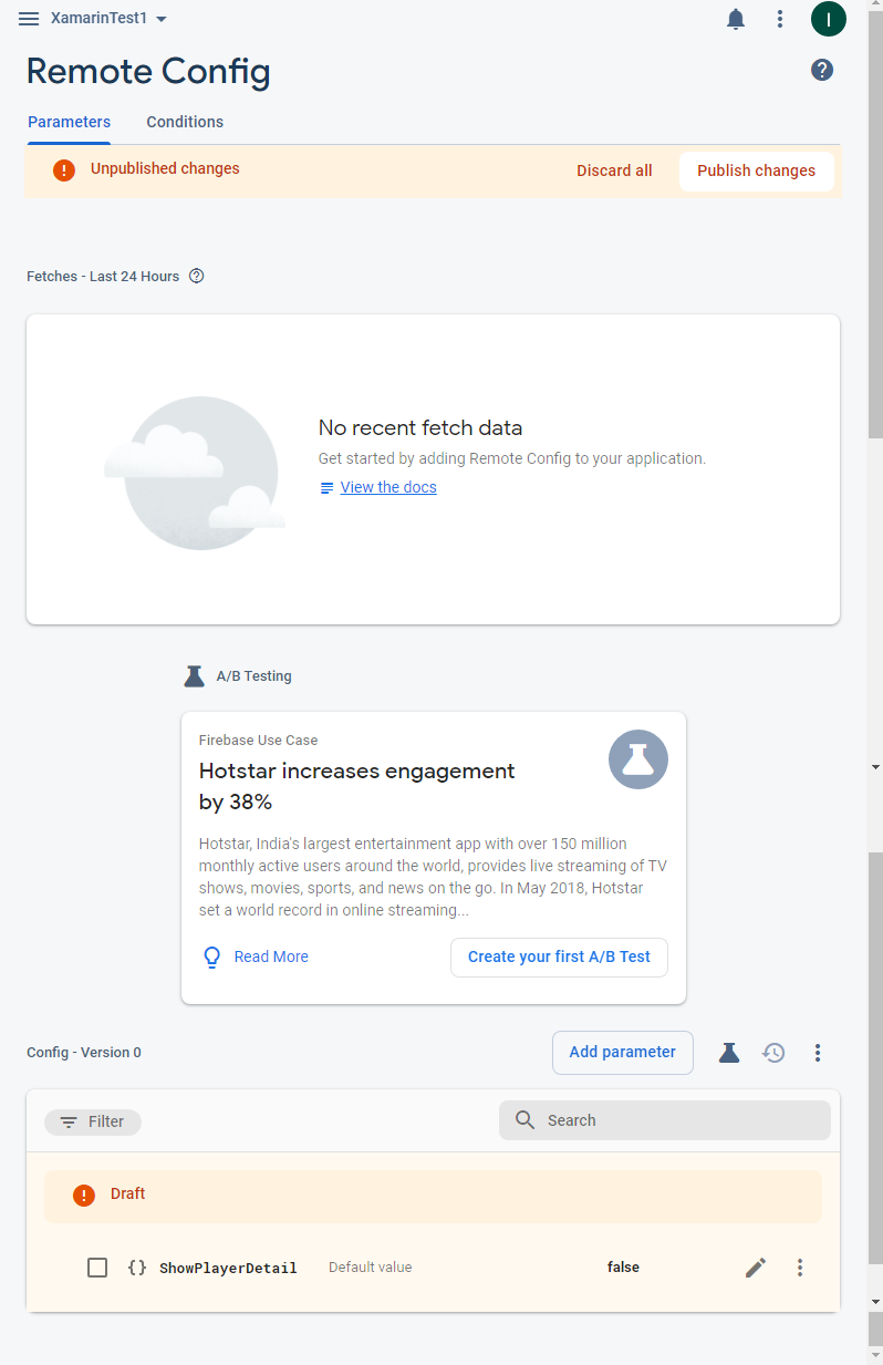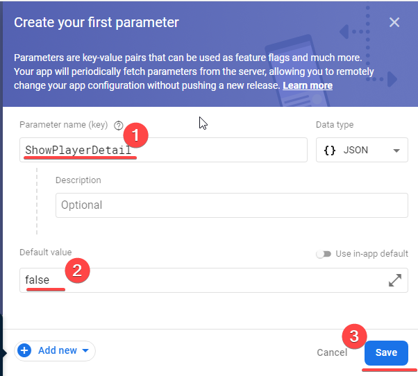 我们可以通过Firebase门户https://console.firebase.google.com/project/Your-Firebase-Project/config设置Firebase远程Config,这是一个简单的过程,因为它的门户GUI是好的和友好的。为此,我们添加了一个新的参数键和默认值,当然它可以是一个json ( GUI有一个工具来验证json内容的格式)。在本例中,键是功能和默认值(Json): { "ShowPlayerDetail":false } 在本例中,我们设置了一个名为ShowPlayerDetail的键来显示或不显示播放机的详细信息。